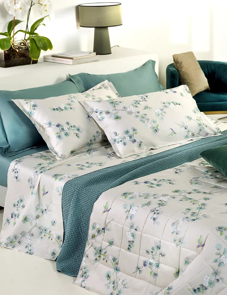 Copriletto trapuntato matrimoniale realizzato in raso di puro cotone 300 T.C. La trapuntatura piazzata esalta il disegno stampato in digitale con delicati motivi floreali. Rifinitura a mano con angoli stondati. Vesti la tua camera da letto con le meravigliose fioriture dei giardini mediterranei e con la raffinatezza della collezione Bloom.